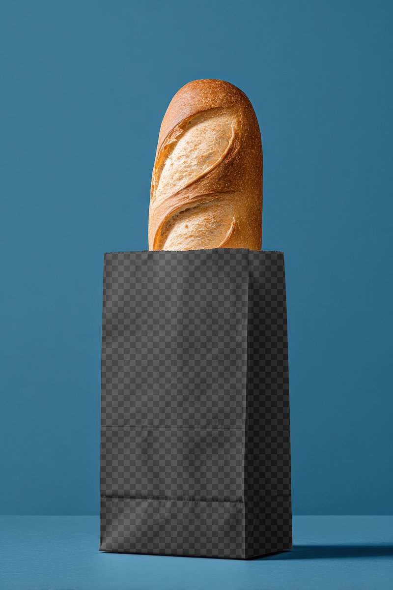 Bread in paper bag mockup png, transparent design https://www.rawpixel.com/image/21357035/bread-paper-bag-mockup-png-transparent-designView license