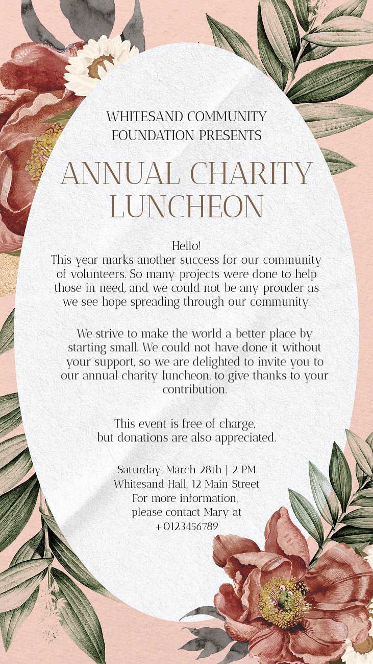 Annual charity luncheon Instagram story template, editable text https://www.rawpixel.com/image/11723952/annual-charity-luncheon-instagram-story-template-editable-textView license